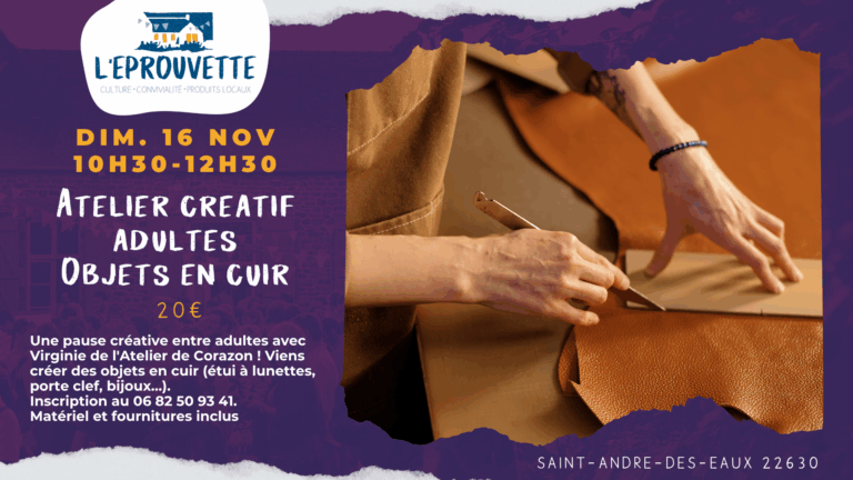 Avec Virginie de l’atelier Corazon, entre adultes ! Viens créer des objets en cuir (étui à lunettes, porte clef, bijoux…). 20€ matériel et fournitures inclus. Inscription au 06 82 50 93 41.