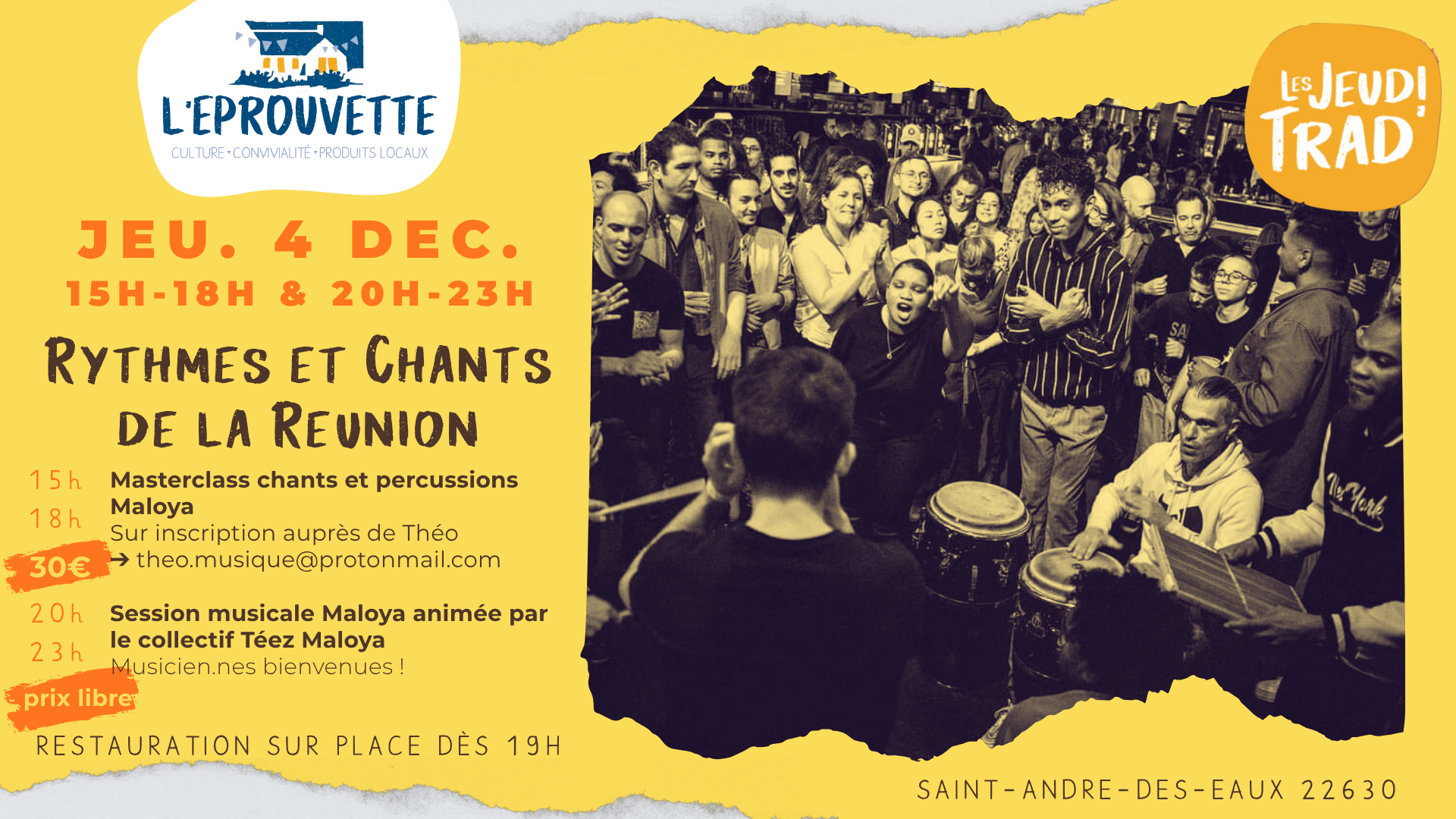 Le collectif Tréez Maloya, né en 2024 de la passion commune pour les rythmes réunionnais, vous invite à une soirée autour du Maloya, musique traditionnelle de La Réunion. Venez découvrir, chanter et jouer sur le répertoire de Gramoun Lélé, Danyel Waro, Mélanz Nasyon, Tifrid et bien d’autres ! 15h – 18h · Masterclass chants et percussions Maloya 30€Inscriptions via Théo,…
