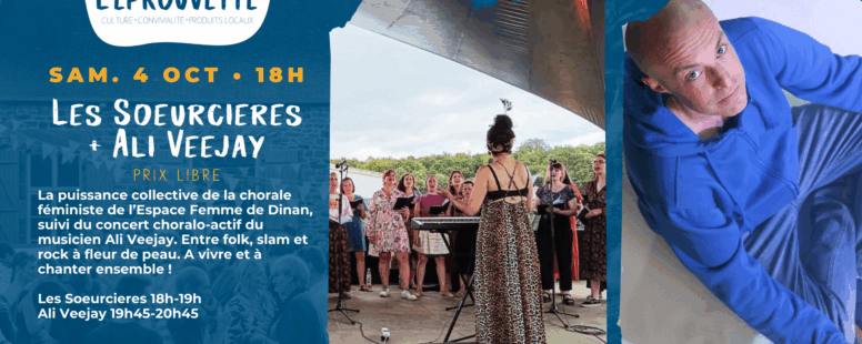 La puissance collective de la chorale féministe de l’Espace Femme de Dinan, suivi du concert choralo-actif du musicien Ali Veejay. Entre folk, slam et rock à fleur de peau. A vivre et à chanter ensemble ! Ali Veejay propose un concert fort, mettant l’accent sur le lien public-artiste. Ballades sensibles y côtoient des morceaux énergiques, liés avec humour par des … Lire la suite de SAM. 4 OCT, 18H-21h • Les Soeurcières + Ali Veejay : Chorale féministe et chansons au looper