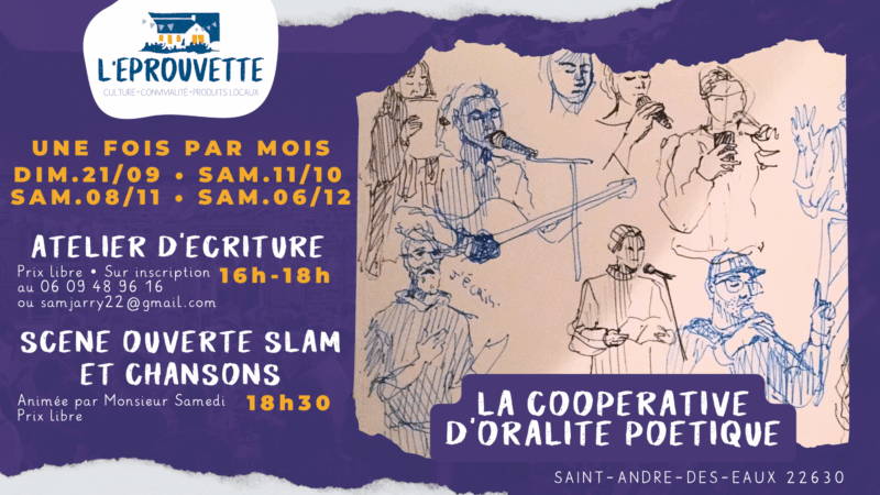 16h-18h ATELIER D’ECRITUREPour les amoureux.ses des mots, cet atelier est propice à la créativité et invite à sortir de ses habitudes dans un cadre bienveillant ! – Animé par Monsieur SAMEDI– Prix libre, sur inscription au 0609489616 ou samjarry22@gmail.com__________________18h30 SCENE OUVERTE SLAM & CHANSONSViens déclamer tes mots, ta poésie, ton rap, ton histoire, ton pamphlet, ta chanson sur la scène…