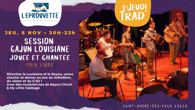 Direction la Louisiane et le Bayou, venez chanter, jouer et danser au son du mélodéon, du violon et du ti fer !Session animée par des musicien.nes de Bayou Chicot & My Little Cabbage. Prix libre Restauration sur place dès 19h.Bar ouvert dès 17h Les jeudis à l’Éprouvette sont sous le signe des musiques, danses traditionnelles et folkloriques d’ici ou d’ailleurs.…