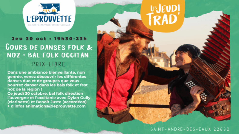 Ce jeudi 30 octobre, après le cours de danses, venez danser avec le clarinettiste Dylan Gully et l’accordéoniste Benoit Juste pour un bal folk aux accents occitans et auvergnat ! Dans une ambiance bienveillante, non genrée, venez découvrir les différentes danses duo et de groupes que vous pourrez danser dans les bals folk et fest noz de la région !…